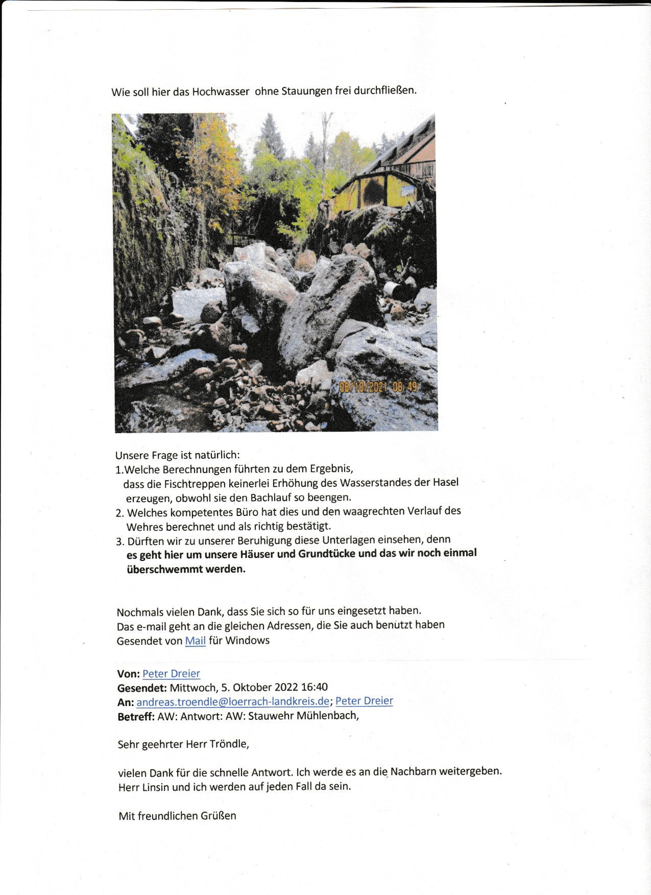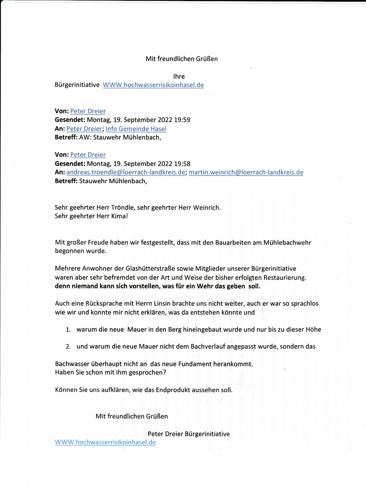 E-mailsvom 19.September 22 bis zum 26.Oktober 22 wegen der Bauweise des Mühlebachwehres