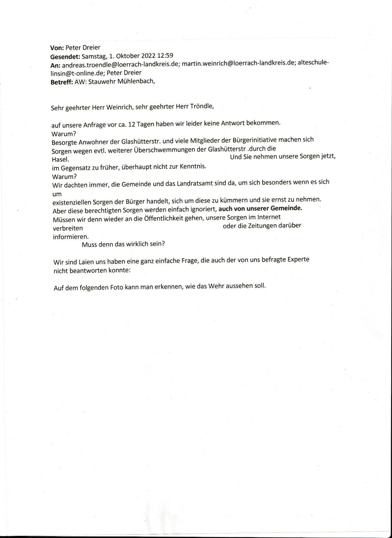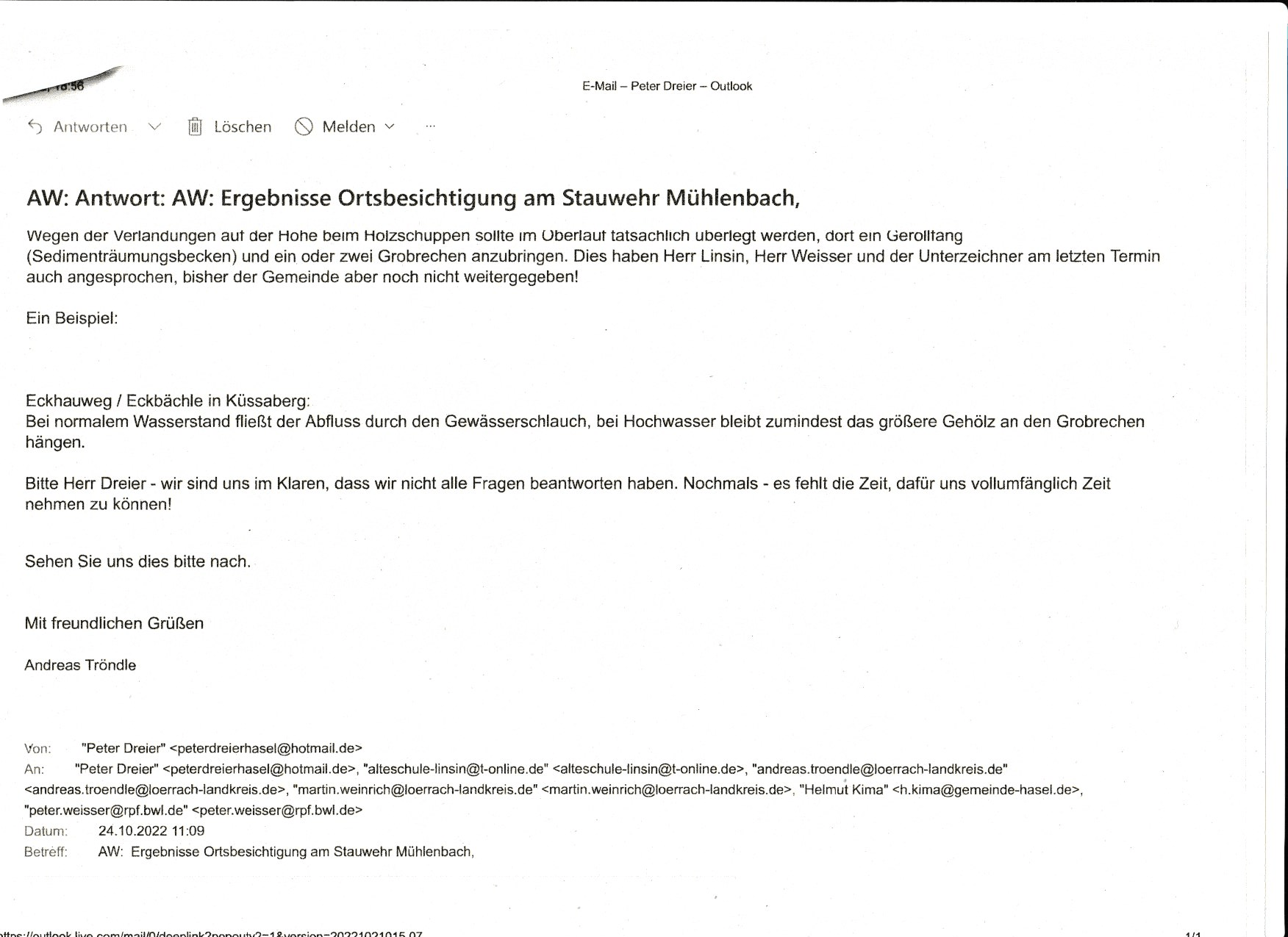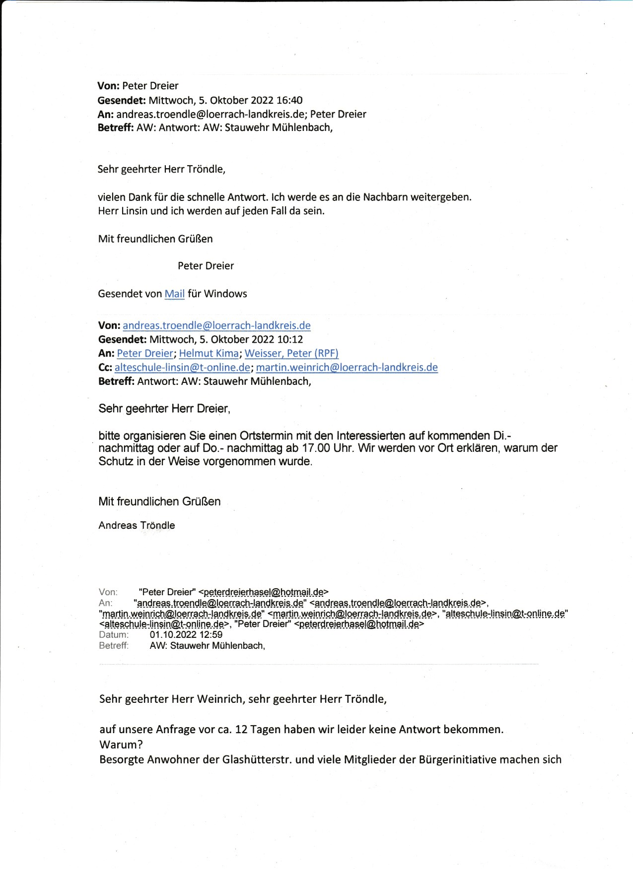 E-mailsvom 19.September 22 bis zum 26.Oktober 22 wegen der Bauweise des Mühlebachwehres