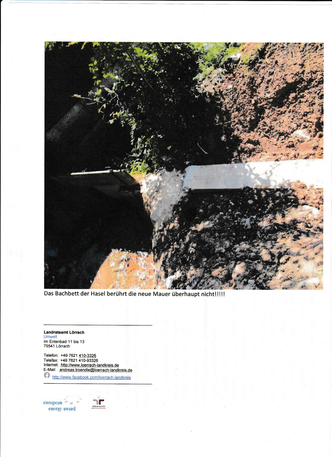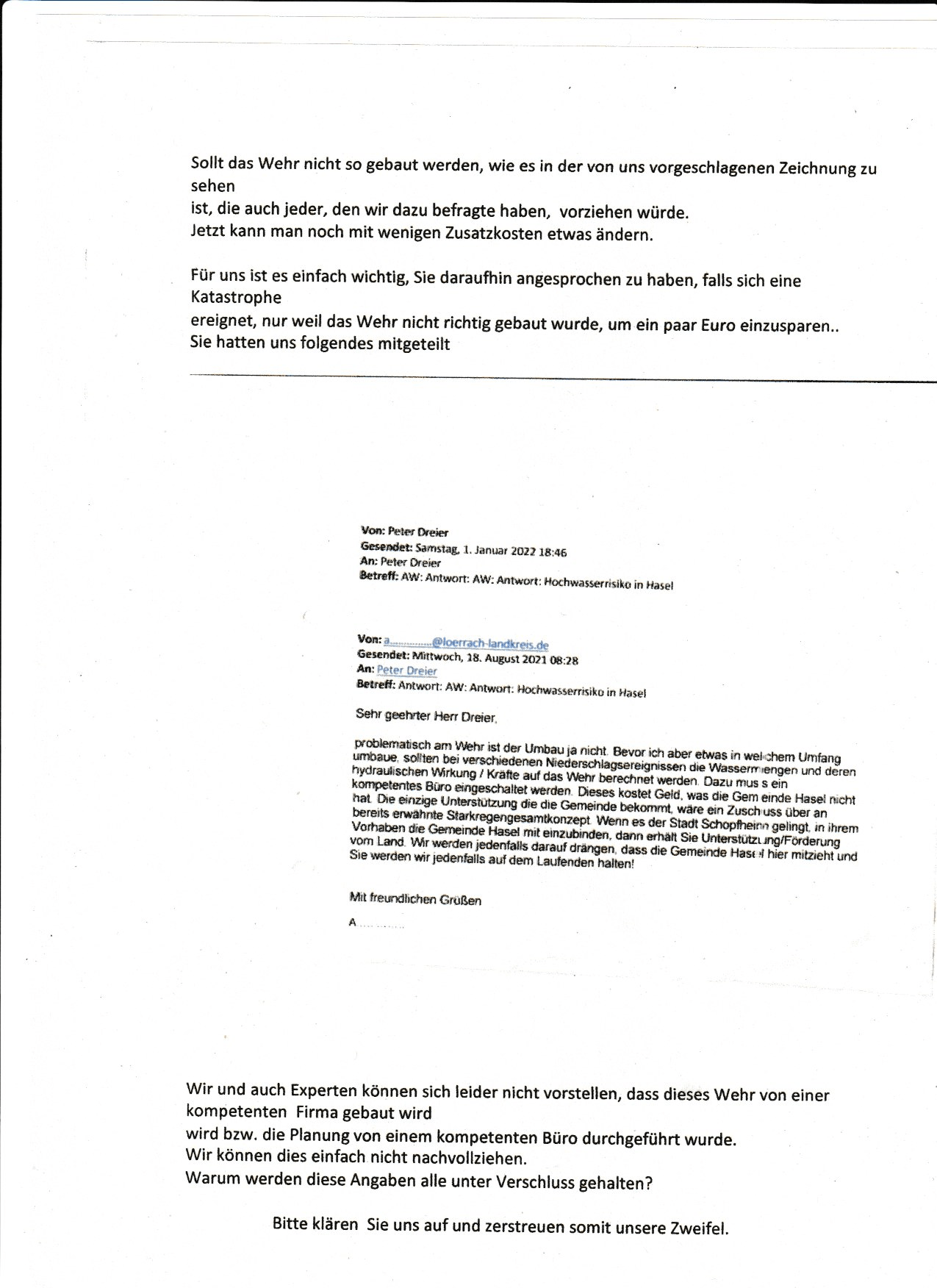 Da die Untere Wasserbehörde, insbesondere der Hochwasserschutz (betrifft meine Person) zu den oben genannten Bauten nicht gehört wurde (zu keiner Zeit involviert war), hat der Unterzeichner das Problem die abgelaufenen Dinge zu reproduzieren und dann zu ordnen. Dafür soll unter anderem das baldmögliche Gespräch im Rathaus zu Hasel dienen.